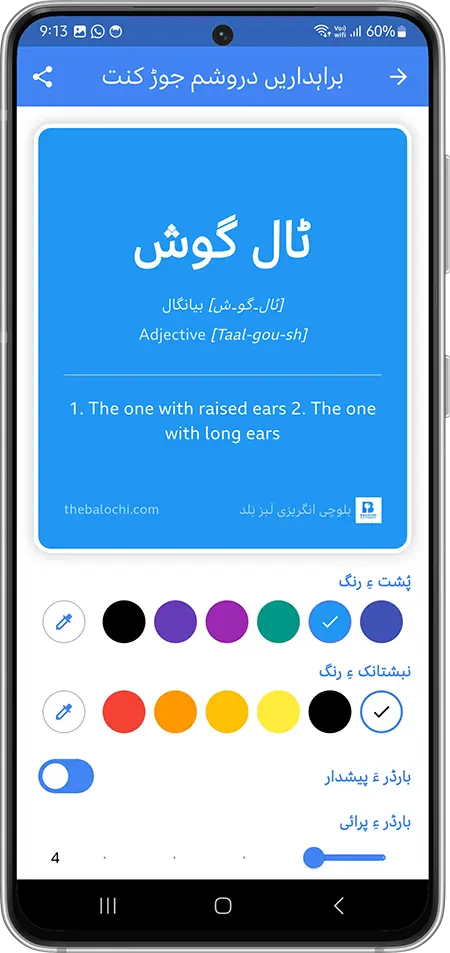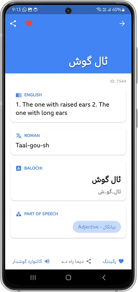 Built on the extensive research of Dr. Naseer Dashti, this app offers an authentic and scholarly exploration of the Balochi language. Perfect for students, researchers, and language enthusiasts, it provides thousands of carefully documented Balochi-English words, along with grammar details, audio pronunciation, and word origins. This is a true dictionary created to preserve and promote the richness of Balochi.